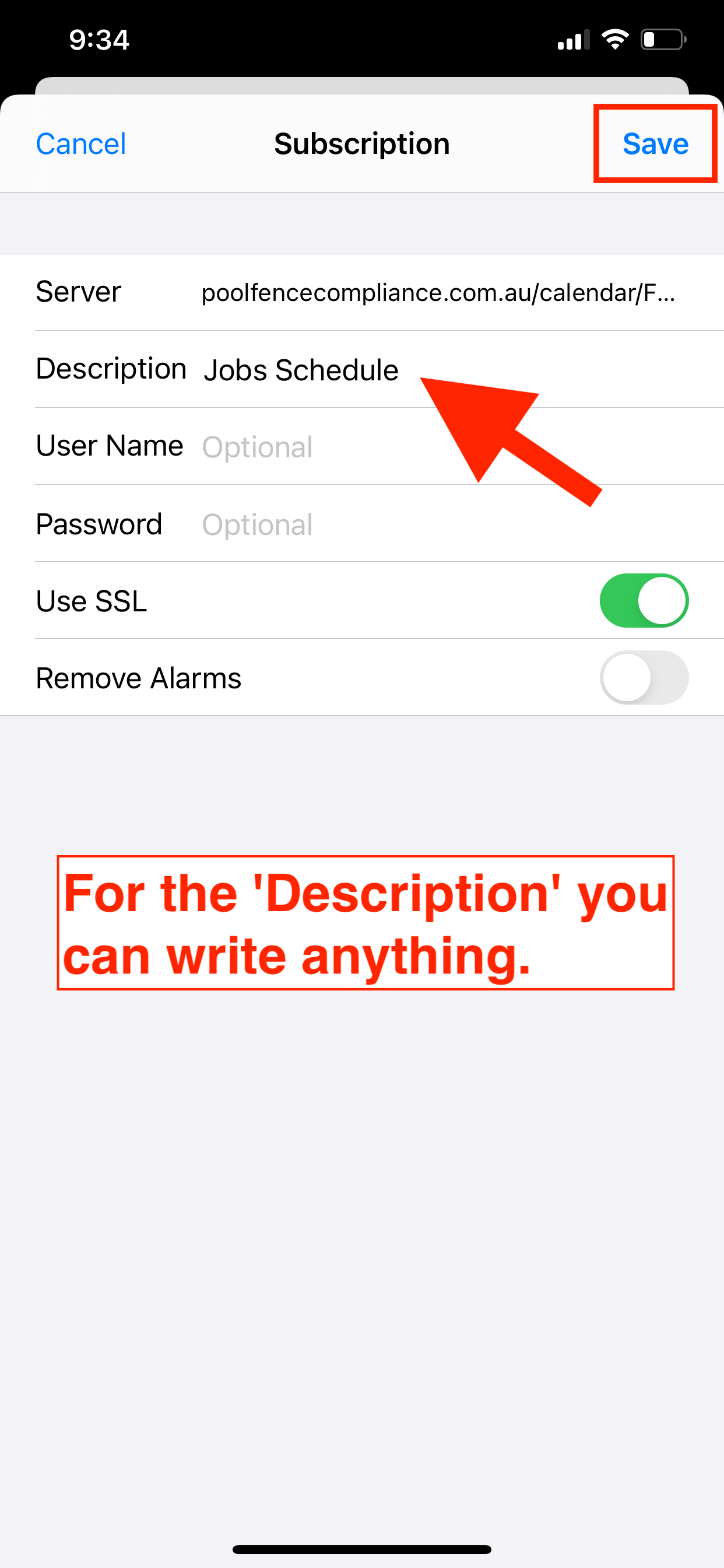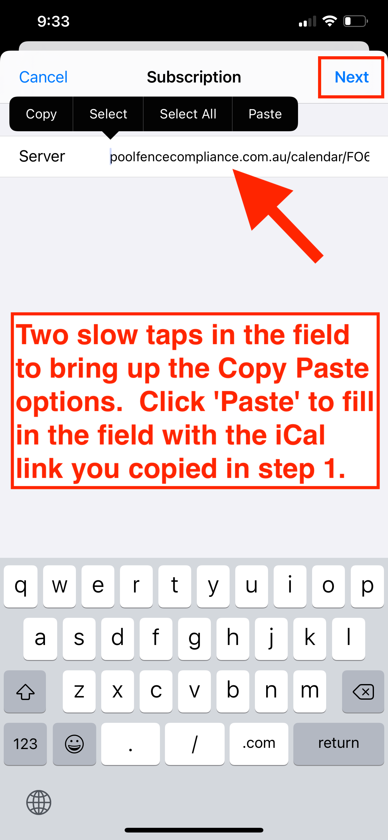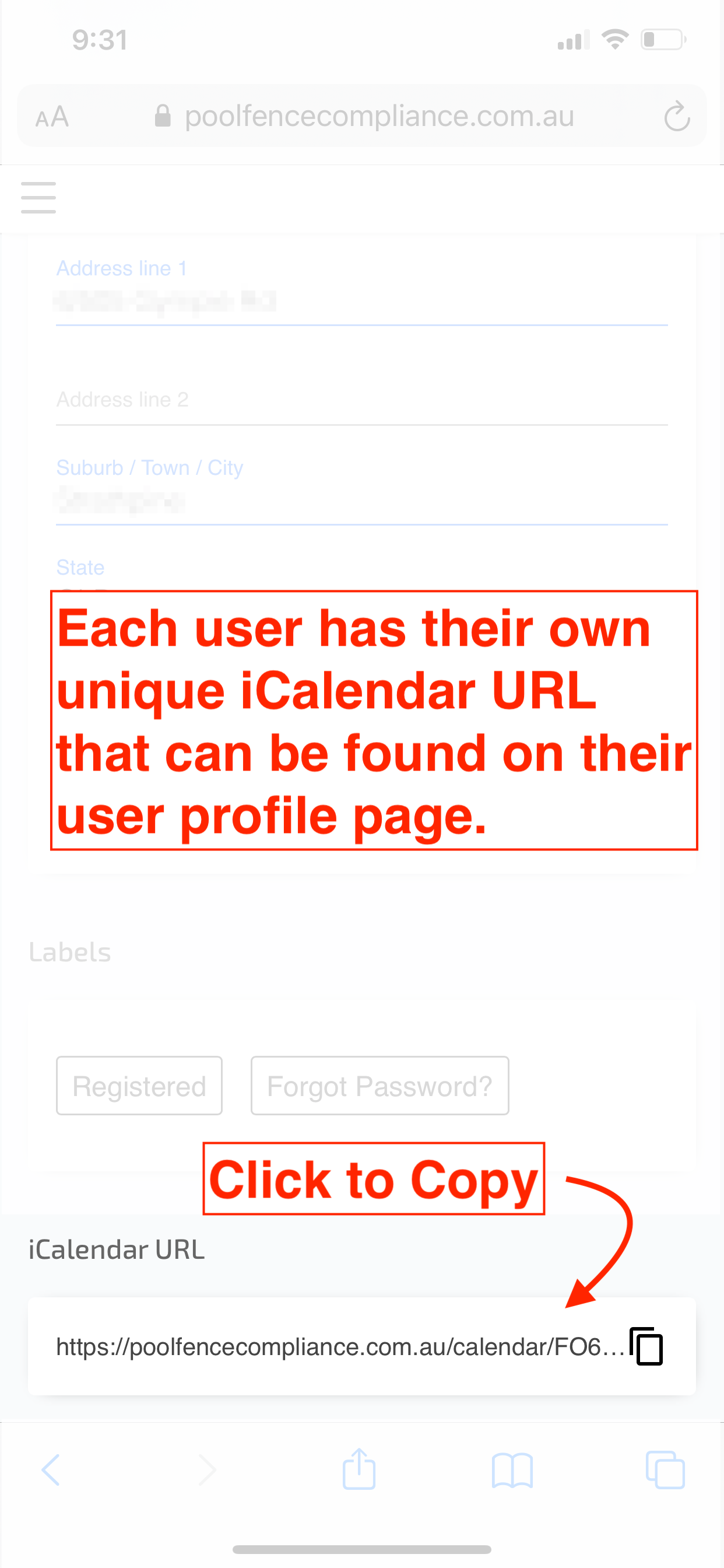 In the Pool Fence Compliance app, go to your user account page and scroll down to the iCalendar URL link. Simply click the link to copy it.