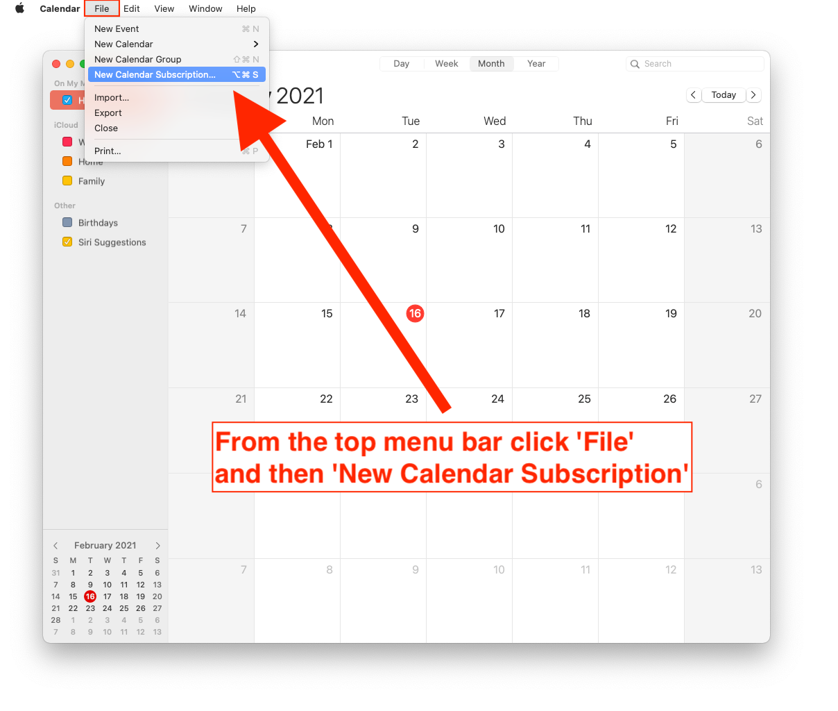 Open the iCalendar app on your Mac and from from the top menu select 'File' and then click on 'New Calendar Subscription'.