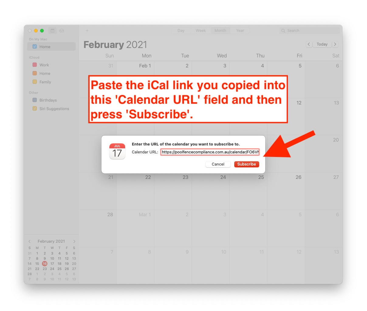 After clicking 'New Calendar Subscription', a prompt will appear in the center of your iCalendar app window that says "Enter the URL of the calendar you want to subscribe to." From here paste in the URL that you copied in step 1, then click 'Subscribe'.